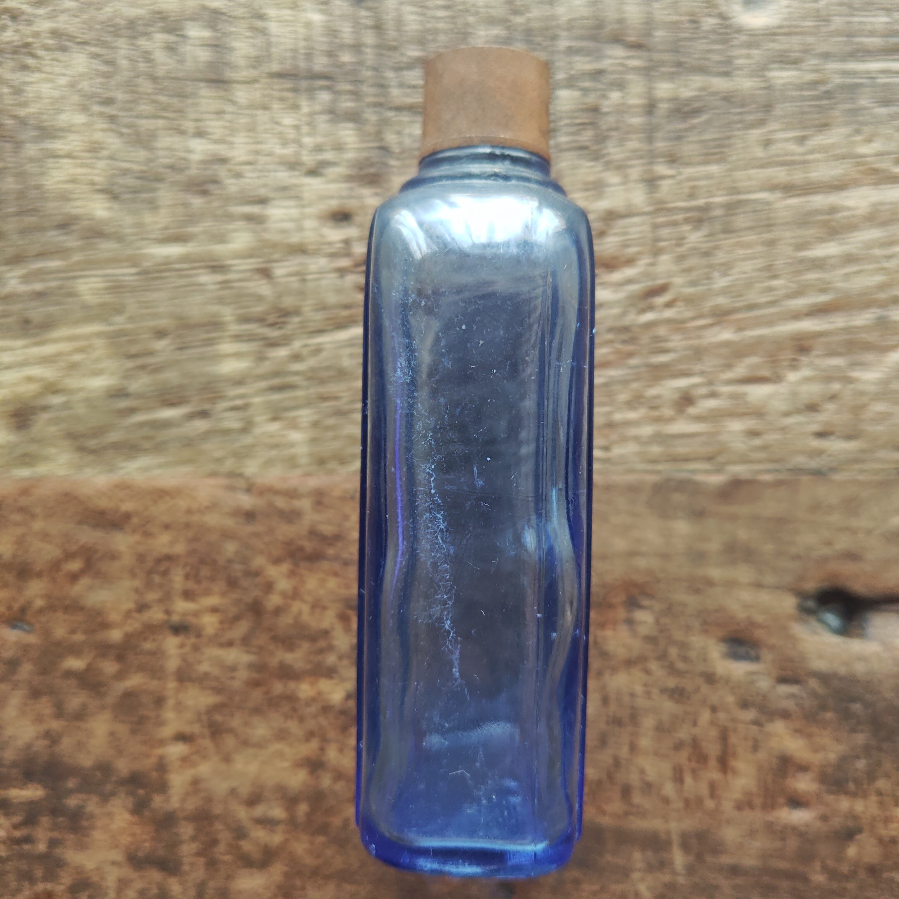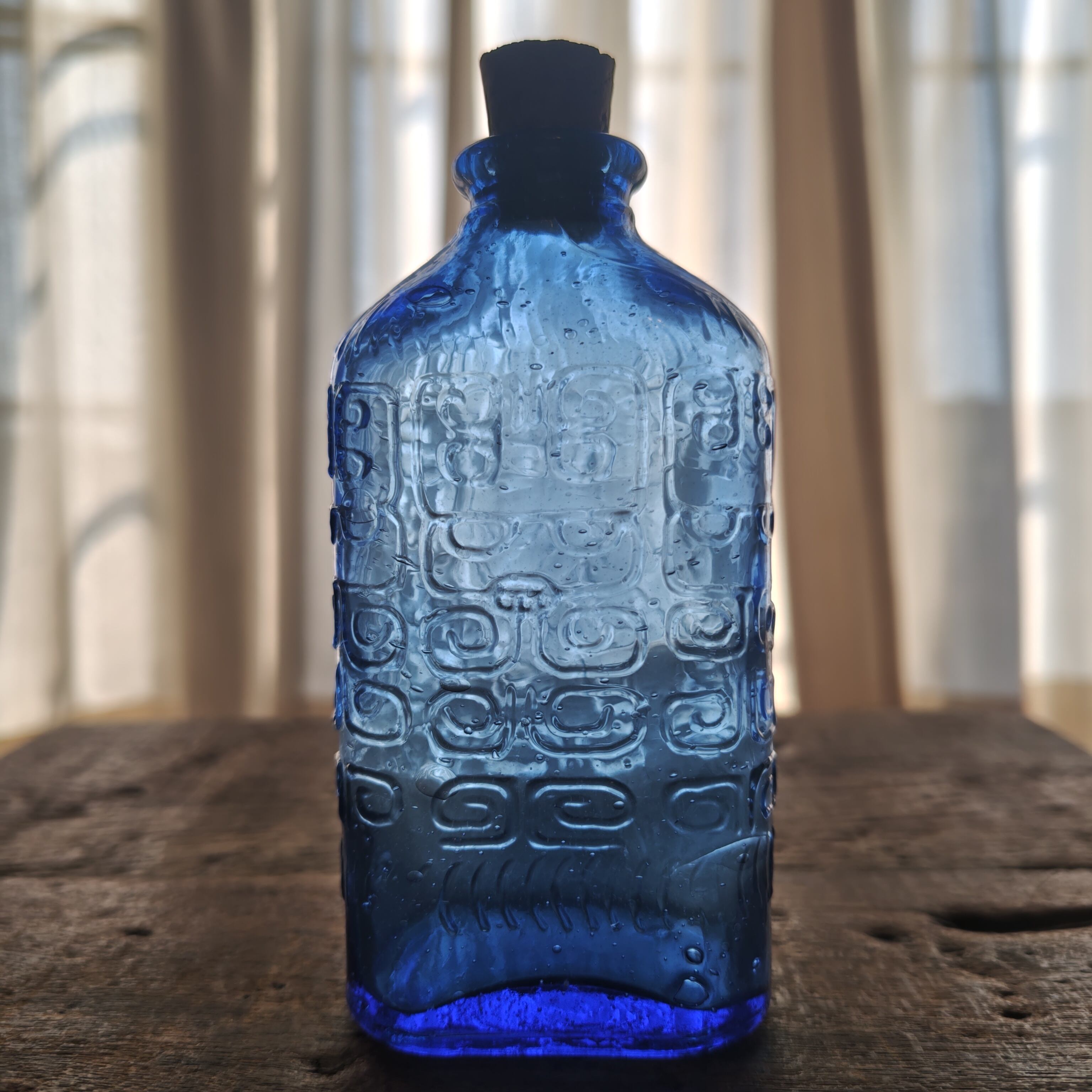 海外製かもしれませんが、ブルーの濃さ、不思議な模様、気泡の入り、良い瓶です